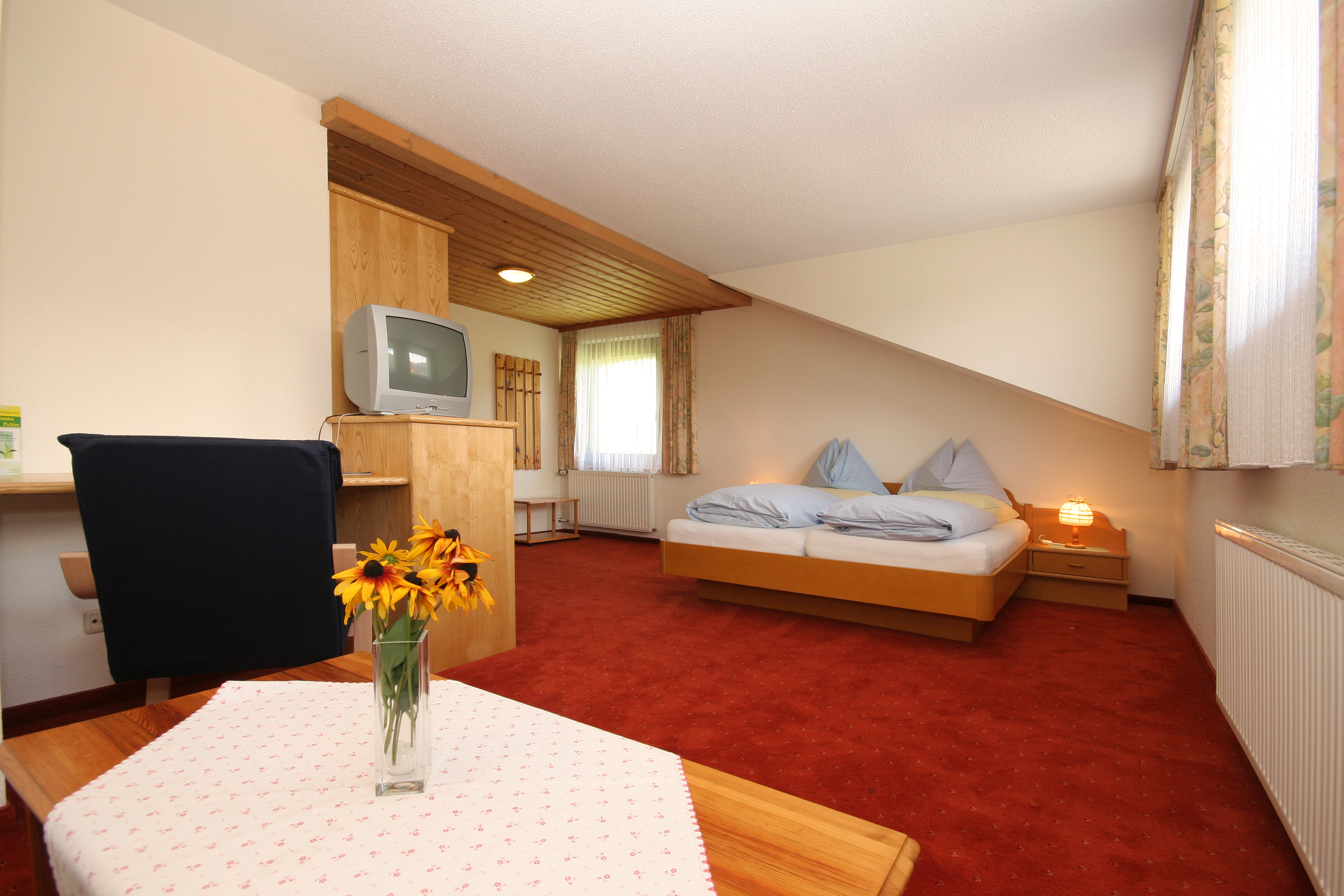 Unsere Zimmer sind gemütlich mit Wohlfühlbetten ausgestattet ebenso mit DU/WC,TV und gratis Wlan. Vom Balkon genießen Sie den Ausblick auf die Bergwelt der Umgebung. Eine Sauna im Haus und eine Hauseigene Massagepraxis runden unser Wohlfühlangebot ab. Bei unserem umfangreichen Frühstücksbuffet bieten wir Ihnen auch sehr viele Regionale Spezialitäten an.